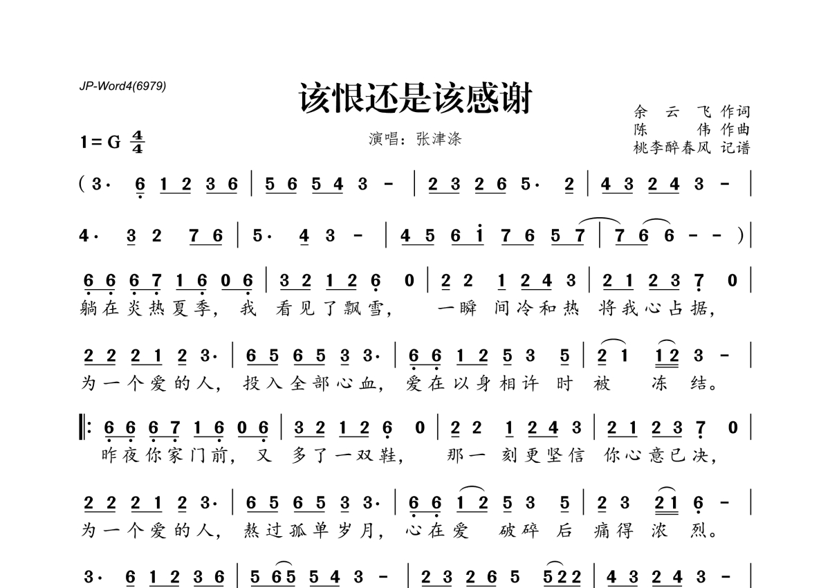 该恨还是该感谢简谱 - 张津涤演唱
