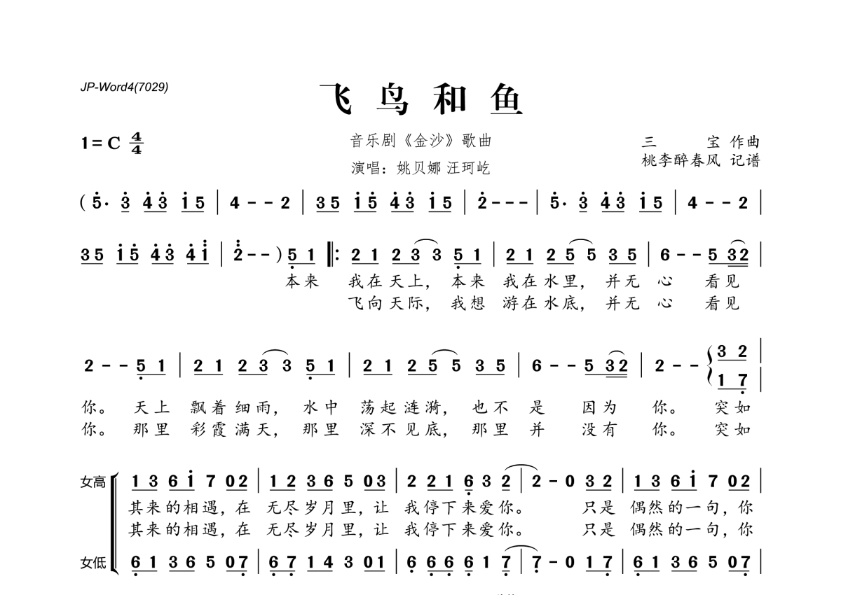 《飞鸟和鱼》是姚贝娜&汪珂屹演唱的一首歌曲,拍号为4/4拍,这份简谱共有两张高清图谱,图谱由 @桃李醉春风 编配上传。