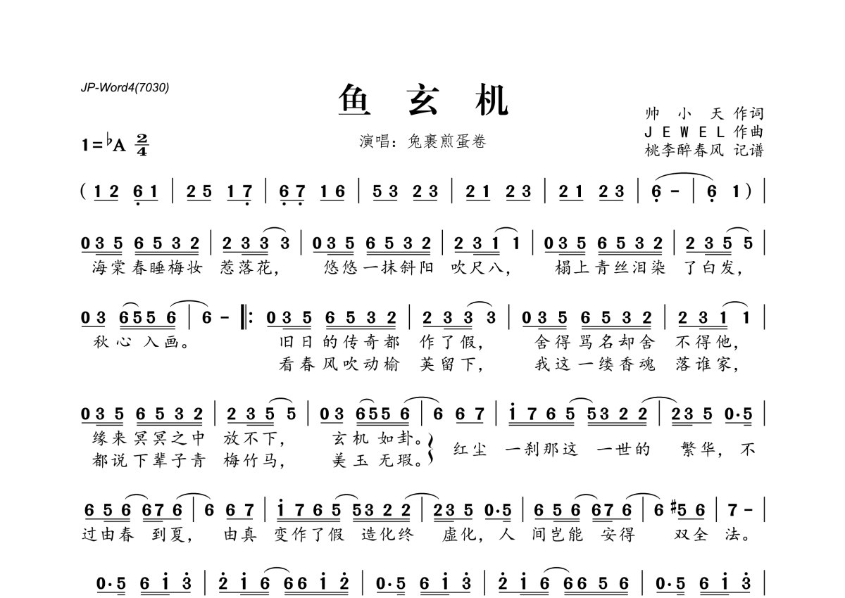 《鱼玄机》是免裹煎蛋卷演唱的一首歌曲,拍号为2/4拍,这份简谱共有一张高清图谱,图谱由 @桃李醉春风 编配上传。