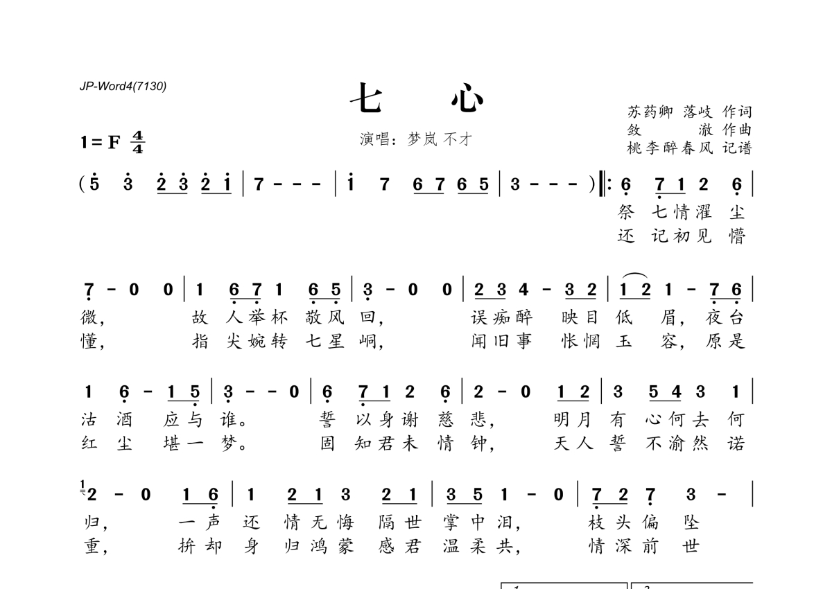 《七心》是梦岚&不才演唱的一首歌曲,拍号为4/4拍,这份简谱共有一张高清图谱,图谱由 @桃李醉春风 编配上传。