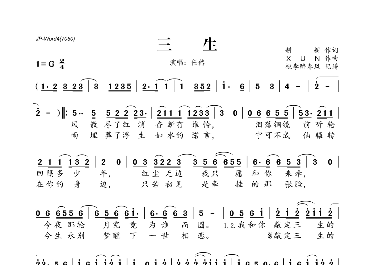 《三生》是任然演唱的一首歌曲,拍号为2/4拍,这份简谱共有一张高清图谱,图谱由 @桃李醉春风 编配上传。
