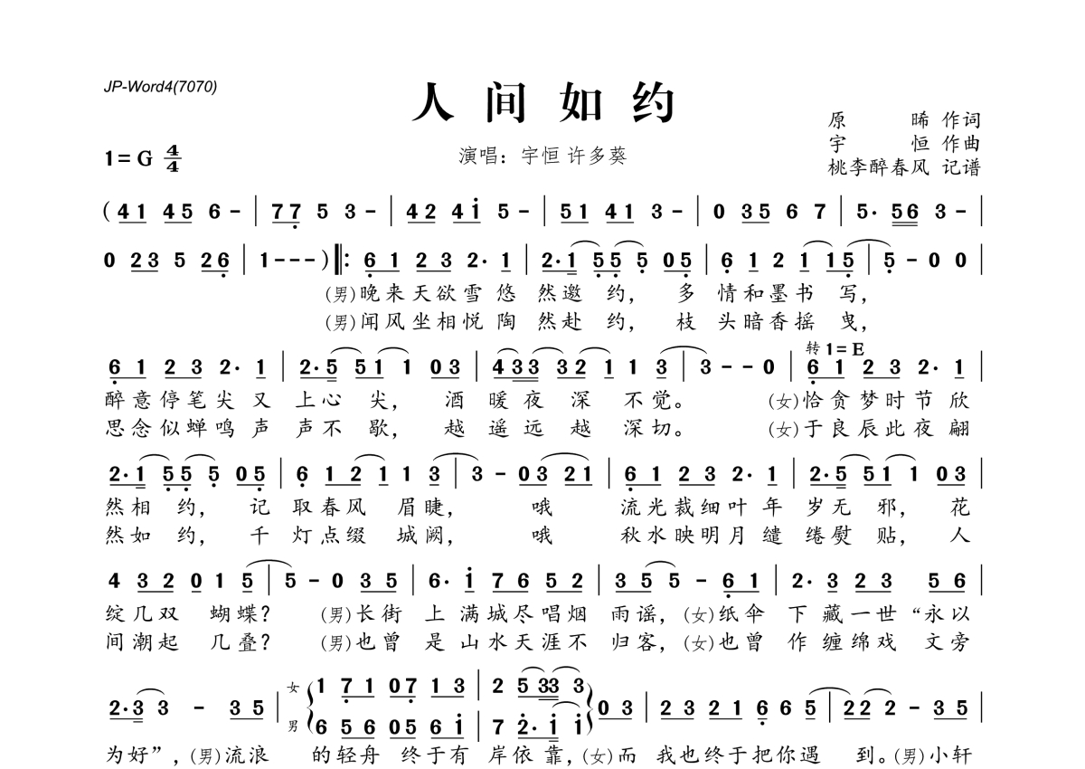 《人间如约》是宇恒&许多葵演唱的一首歌曲,拍号为4/4拍,这份简谱共有一张高清图谱,图谱由 @桃李醉春风 编配上传。