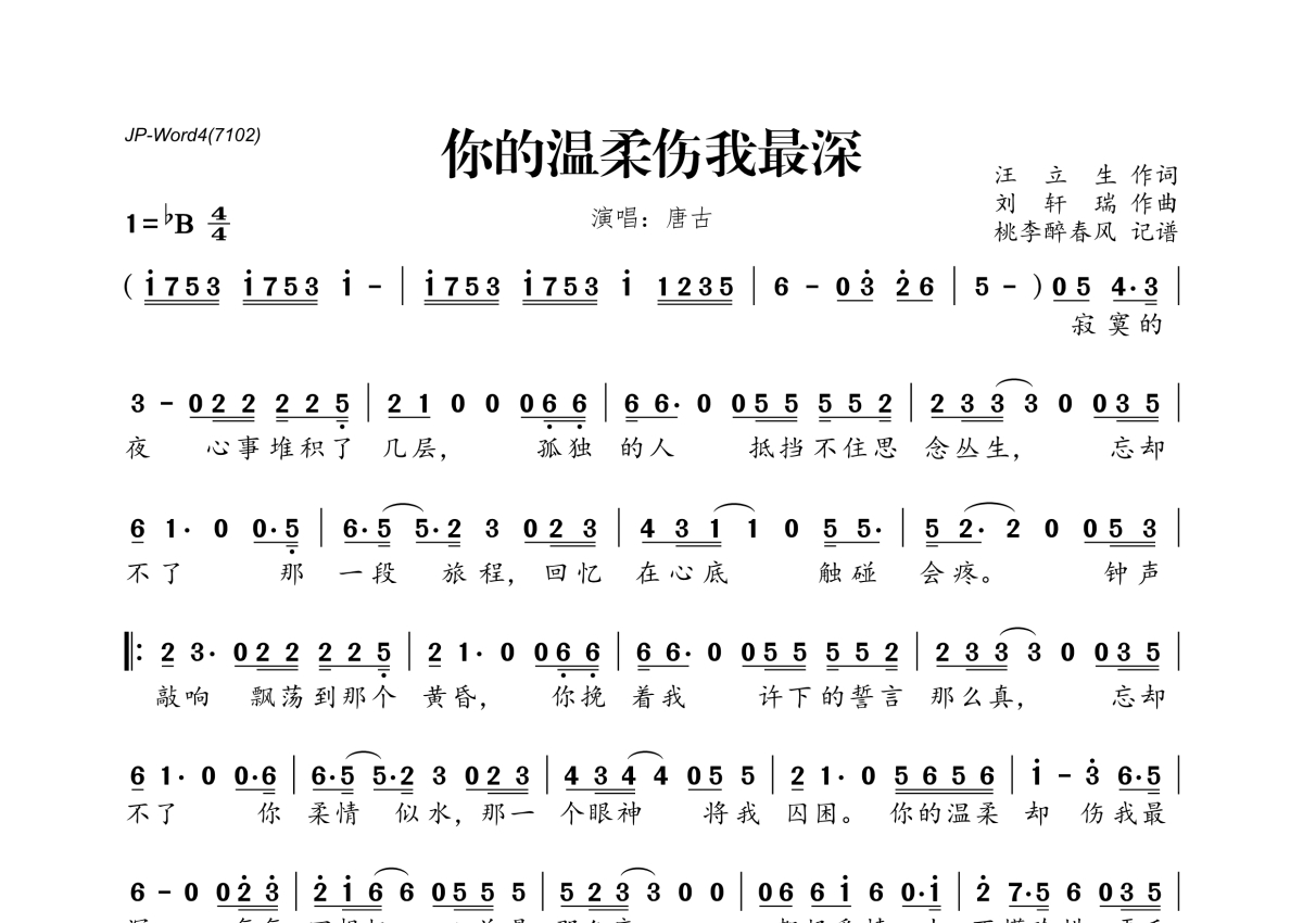 《你的温柔伤我最深》是唐古演唱的一首歌曲,拍号为4/4拍,这份简谱共有一张高清图谱,图谱由 @桃李醉春风 编配上传。