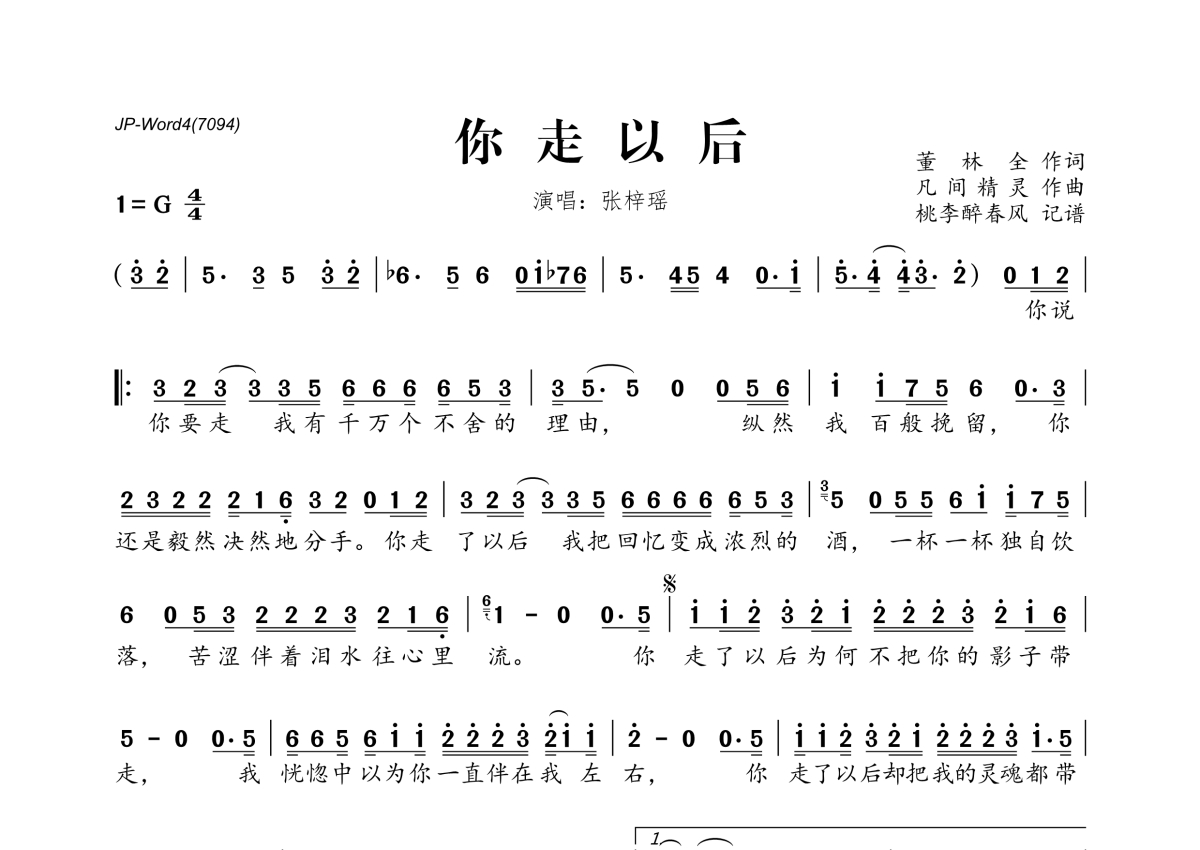 《你走以后》是张梓瑶演唱的一首歌曲,拍号为4/4拍,这份简谱共有一张高清图谱,图谱由 @桃李醉春风 编配上传。