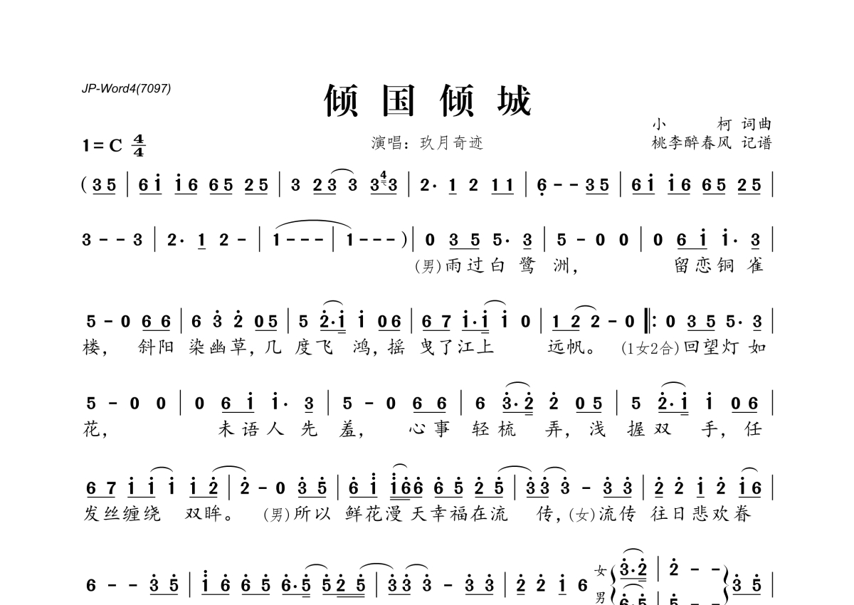 《倾国倾城》是玖月奇迹演唱的一首歌曲,拍号为4/4拍,这份简谱共有一张高清图谱,图谱由 @桃李醉春风 编配上传。