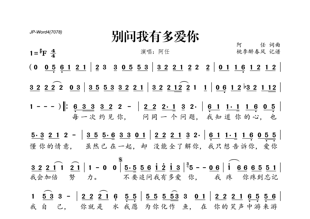 《别问我有多爱你》是阿任演唱的一首歌曲,拍号为4/4拍,这份简谱共有一张高清图谱,图谱由 @桃李醉春风 编配上传。
