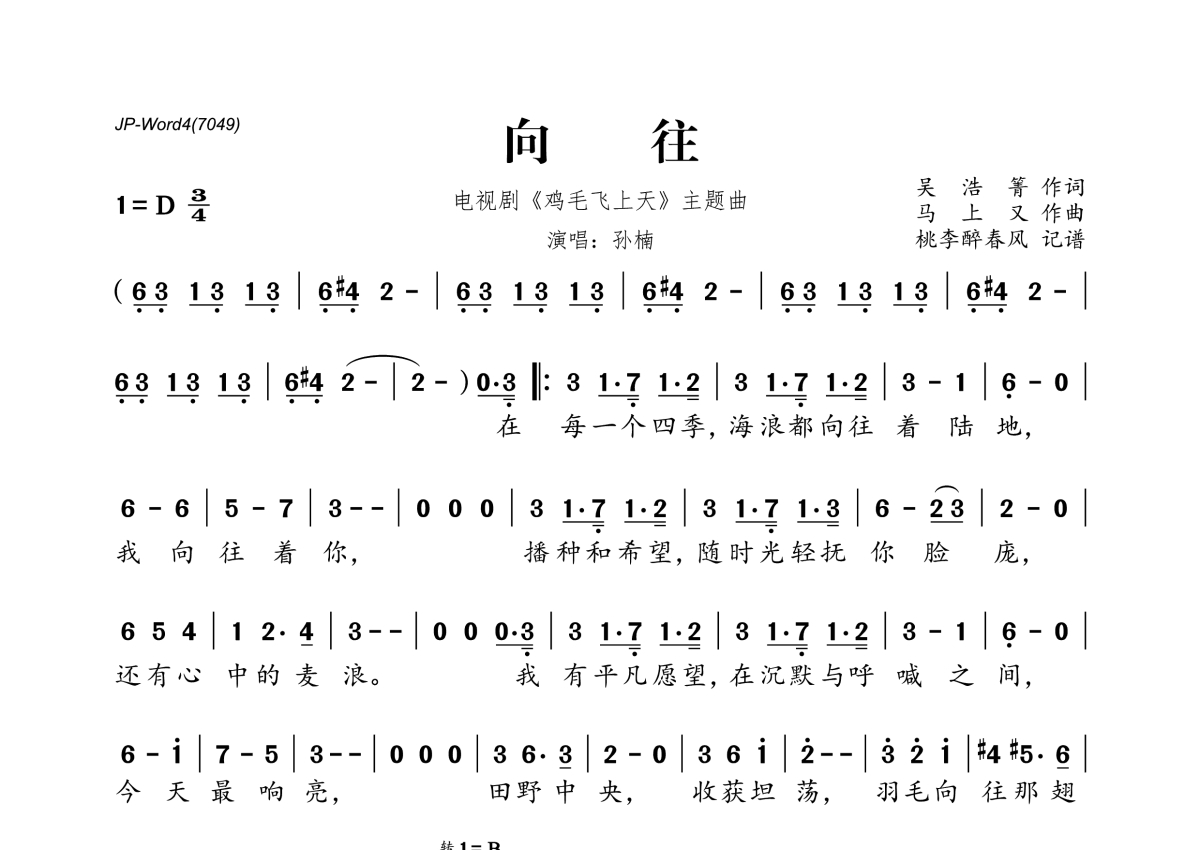 《向往》是孙楠演唱的一首歌曲,拍号为3/4拍,这份简谱共有一张高清图谱,图谱由 @桃李醉春风 编配上传。