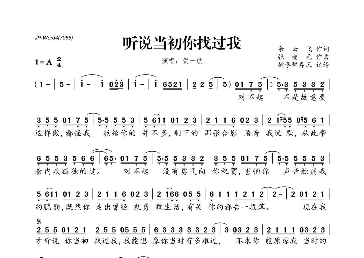 贺一航《听说当初你找过我》简谱