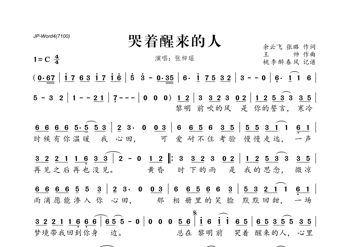 《哭着醒来的人》是张梓瑶演唱的一首歌曲,拍号为4/4拍,这份简谱共有一张高清图谱,图谱由 @桃李醉春风 编配上传。