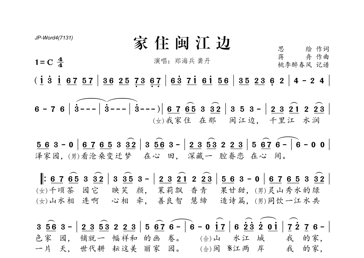 《家住闽江边》是郑海兵&龚丹演唱的一首歌曲,拍号为4/4拍,这份简谱共有一张高清图谱,图谱由 @桃李醉春风 编配上传。