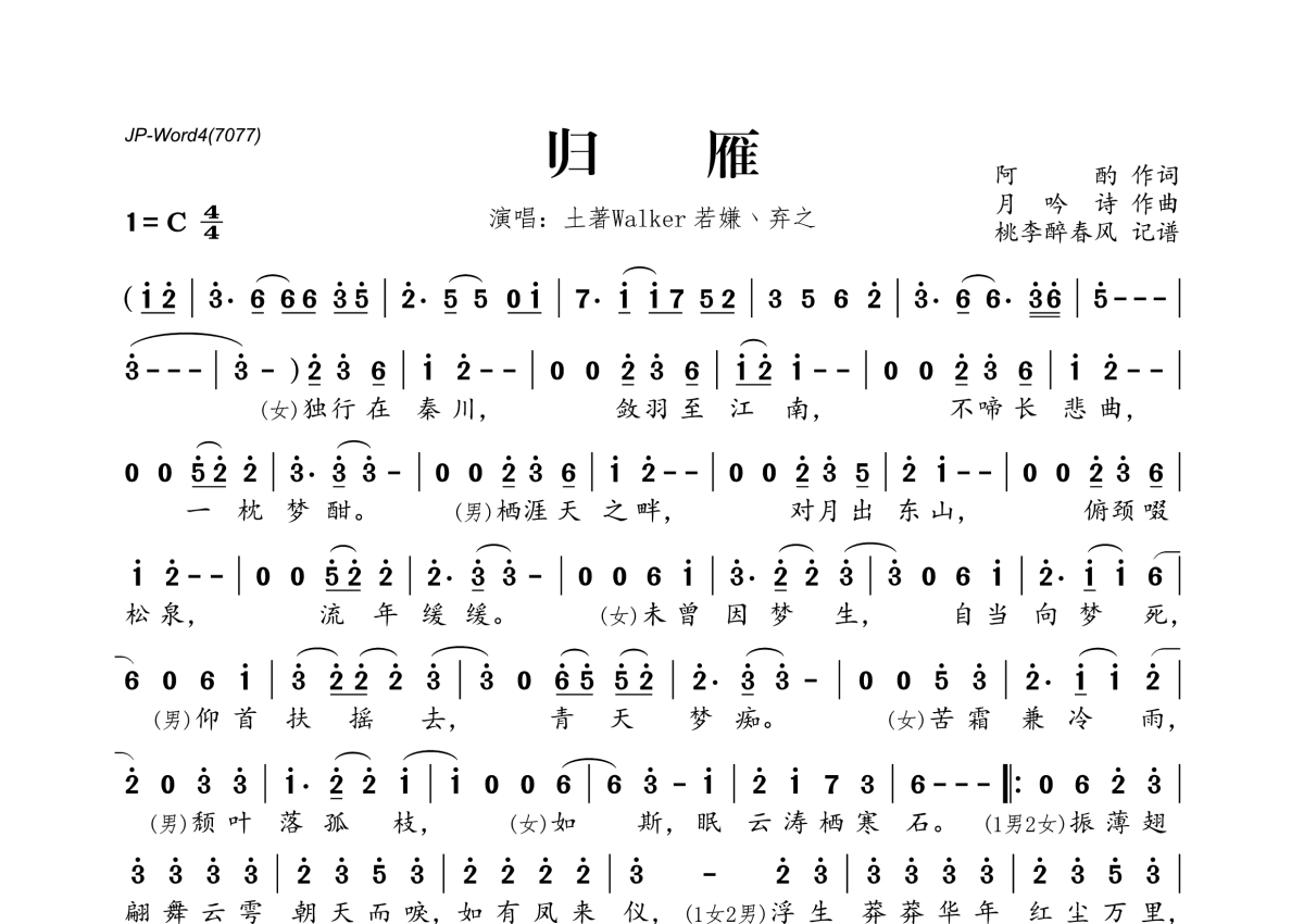 《归雁》是土著Walker&若嫌、弃之演唱的一首歌曲,拍号为4/4拍,这份简谱共有一张高清图谱,图谱由 @桃李醉春风 编配上传。