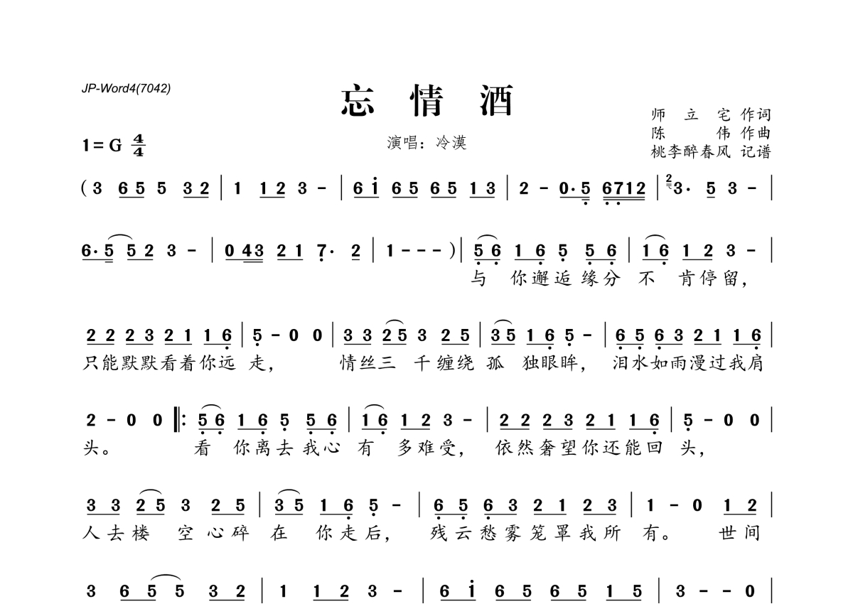 《忘情酒》是冷漠演唱的一首歌曲,拍号为4/4拍,这份简谱共有一张高清图谱,图谱由 @桃李醉春风 编配上传。