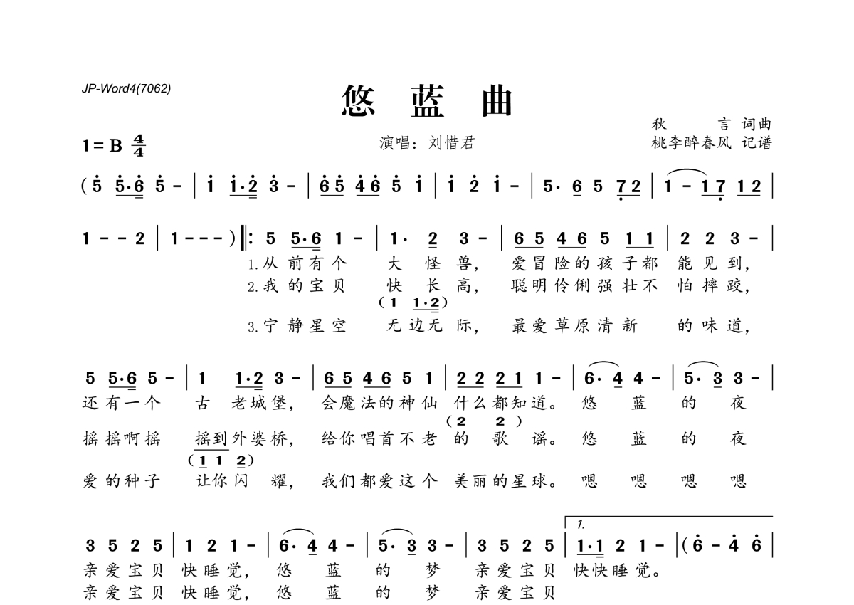《悠蓝曲》是刘惜君演唱的一首歌曲,拍号为4/4拍,这份简谱共有一张高清图谱,图谱由 @桃李醉春风 编配上传。