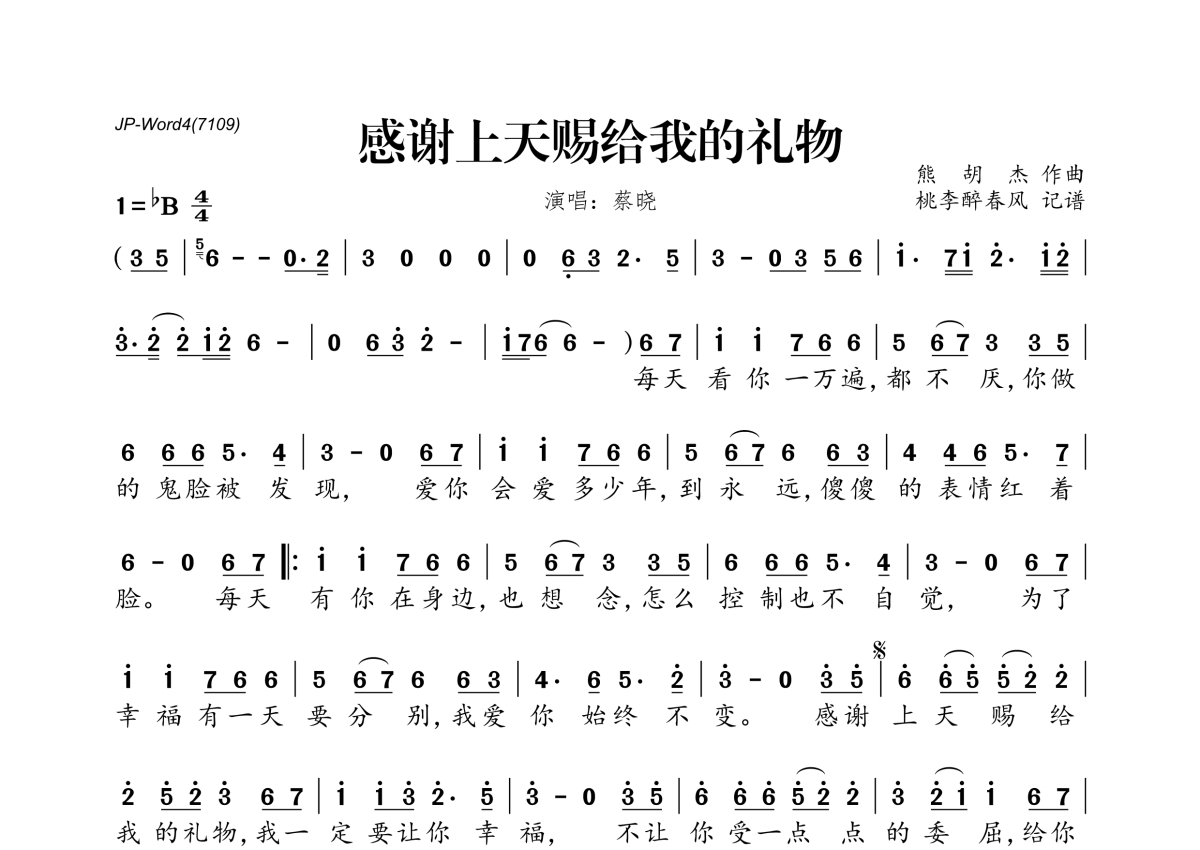 《感谢上天赐给我的礼物》是蔡晓演唱的一首歌曲,拍号为4/4拍,这份简谱共有一张高清图谱,图谱由 @桃李醉春风 编配上传。