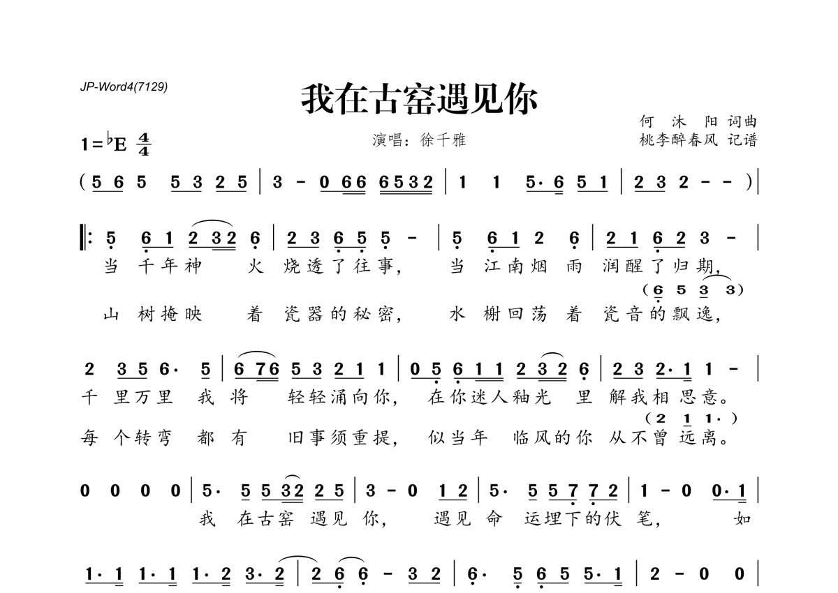 《我在古窑遇见你》是徐千雅演唱的一首歌曲,拍号为4/4拍,这份简谱共有一张高清图谱,图谱由 @桃李醉春风 编配上传。