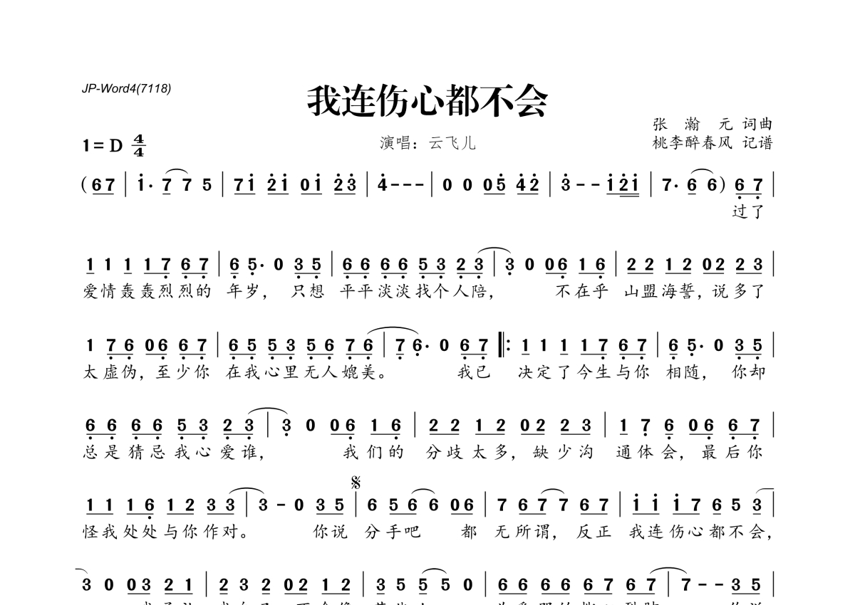 《我连伤心都不会》是云飞儿演唱的一首歌曲,拍号为4/4拍,这份简谱共有一张高清图谱,图谱由 @桃李醉春风 编配上传。