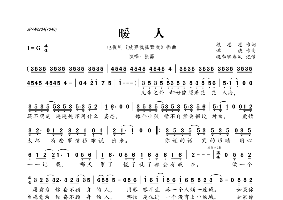 《暖人》是张磊演唱的一首歌曲,拍号为4/4拍,这份简谱共有一张高清图谱,图谱由 @桃李醉春风 编配上传。