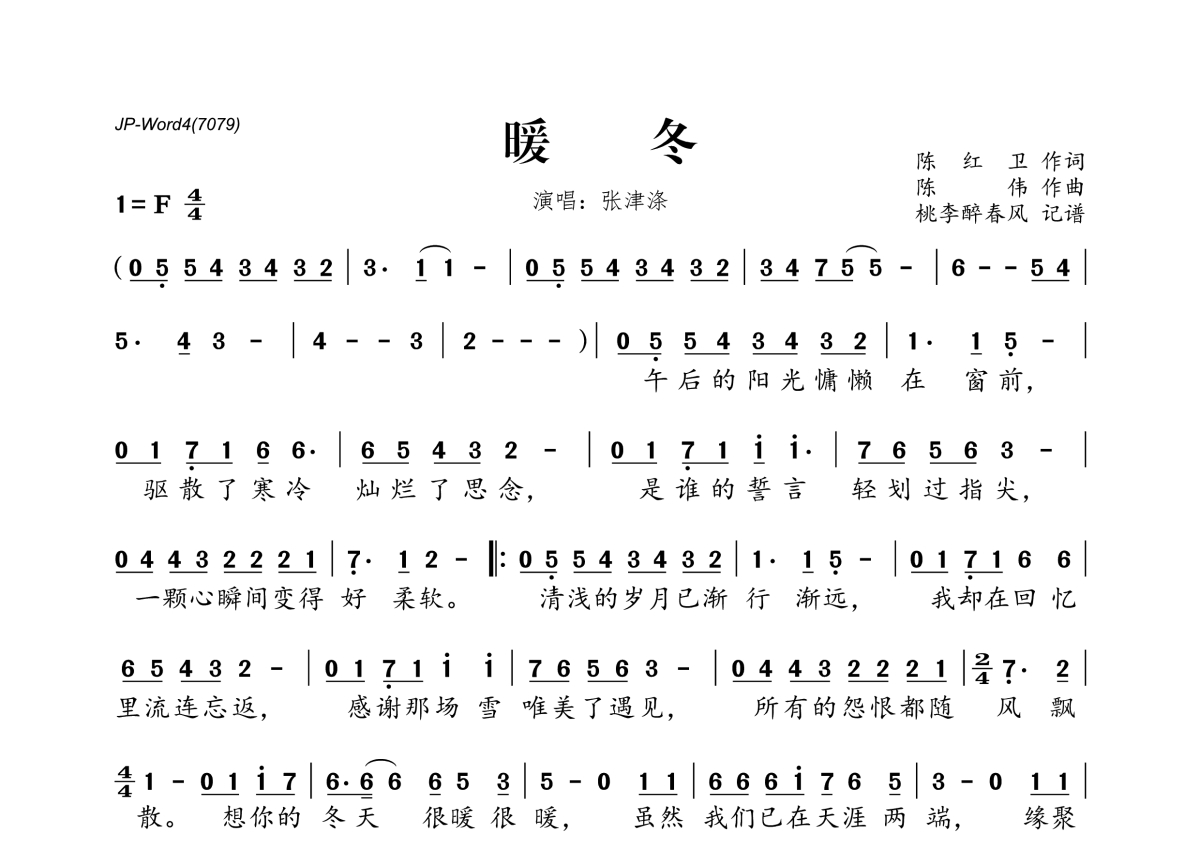 《暖冬》是张津涤演唱的一首歌曲,拍号为4/4拍,这份简谱共有一张高清图谱,图谱由 @桃李醉春风 编配上传。
