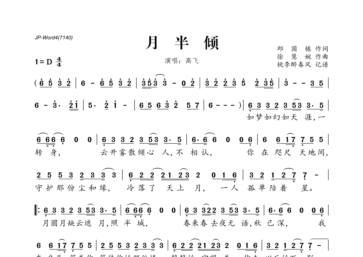 《月半倾》是高飞演唱的一首歌曲,拍号为4/4拍,这份简谱共有一张高清图谱,图谱由 @桃李醉春风 编配上传。