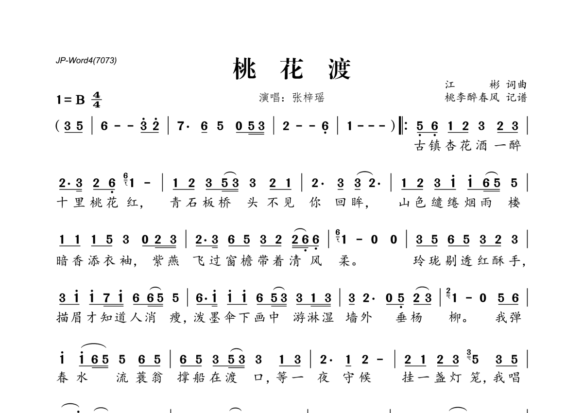 《桃花渡》是张梓瑶演唱的一首歌曲,拍号为4/4拍,这份简谱共有一张高清图谱,图谱由 @桃李醉春风 编配上传。