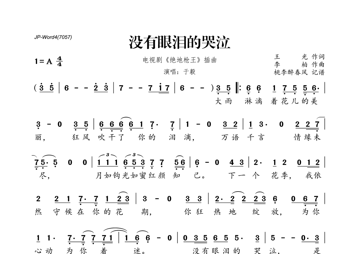 《没有眼泪的哭泣》是于毅演唱的一首歌曲,拍号为4/4拍,这份简谱共有一张高清图谱,图谱由 @桃李醉春风 编配上传。