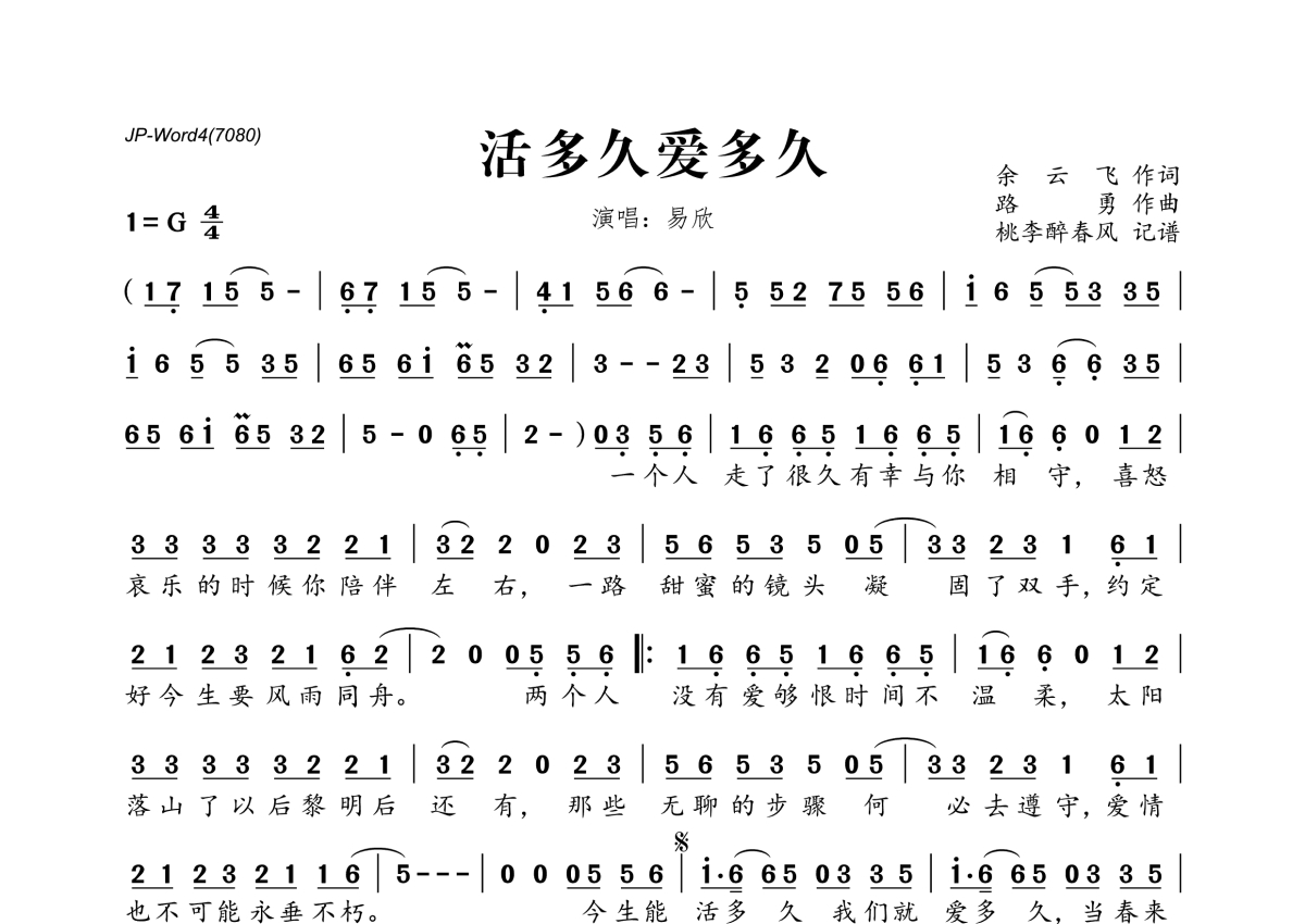 《活多久爱多久》是易欣演唱的一首歌曲,拍号为4/4拍,这份简谱共有一张高清图谱,图谱由 @桃李醉春风 编配上传。