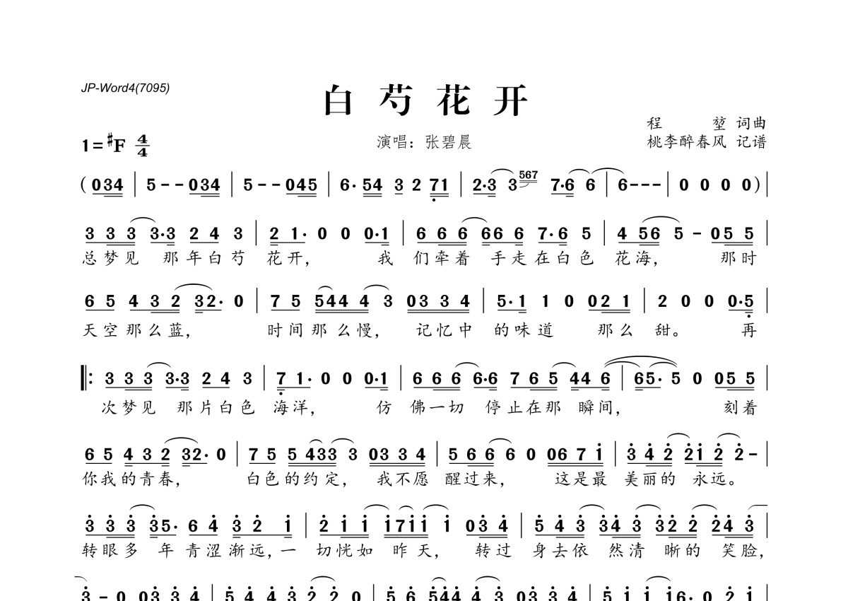 《白芍花开》是张碧晨演唱的一首歌曲,拍号为4/4拍,这份简谱共有一张高清图谱,图谱由 @桃李醉春风 编配上传。