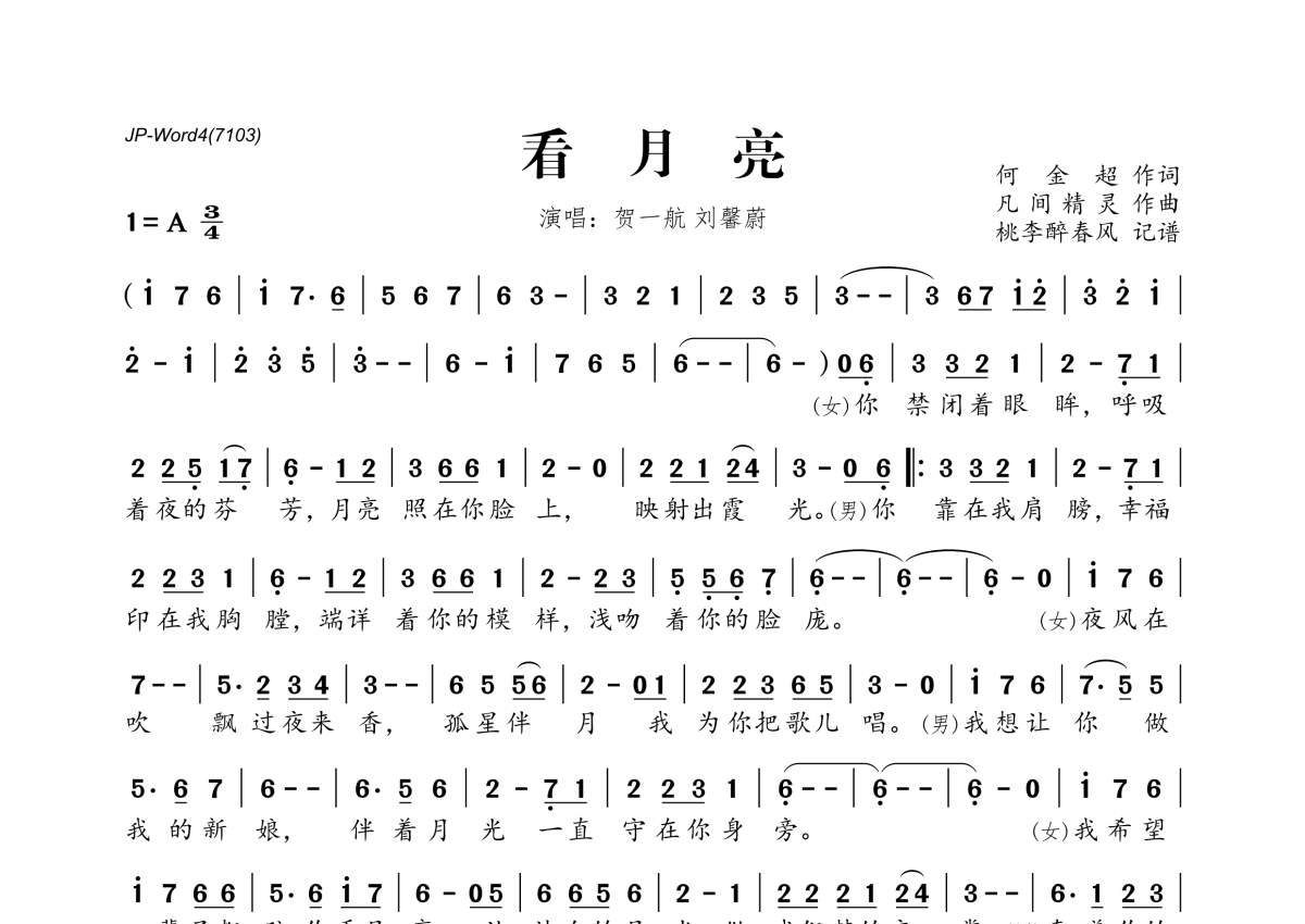 看月亮简谱 - 贺一航&刘馨蔚演唱