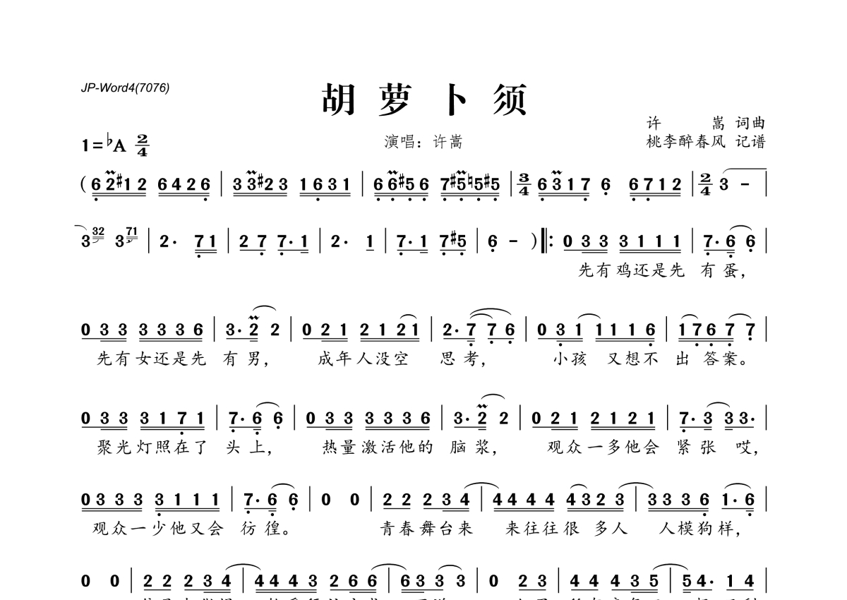 《胡萝卜须》是许嵩演唱的一首歌曲,拍号为2/4拍,这份简谱共有一张高清图谱,图谱由 @桃李醉春风 编配上传。