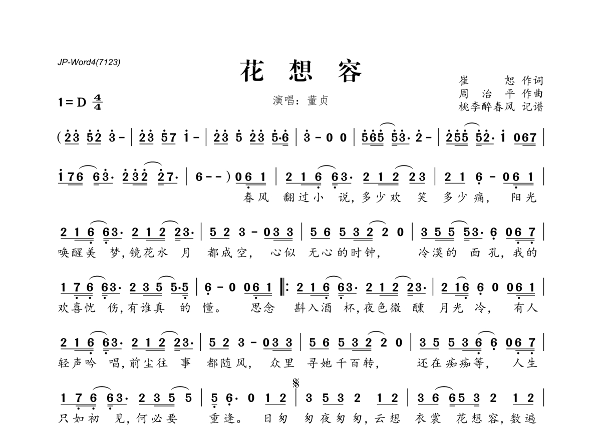 《花想容》是董真演唱的一首歌曲,拍号为4/4拍,这份简谱共有一张高清图谱,图谱由 @桃李醉春风 编配上传。