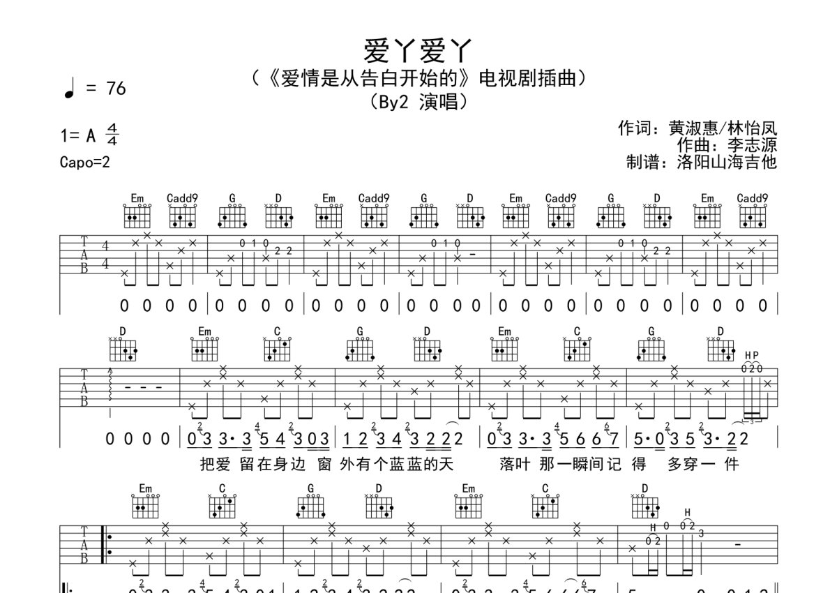 BY2《爱丫爱丫》吉他谱 - G调弹唱六线谱