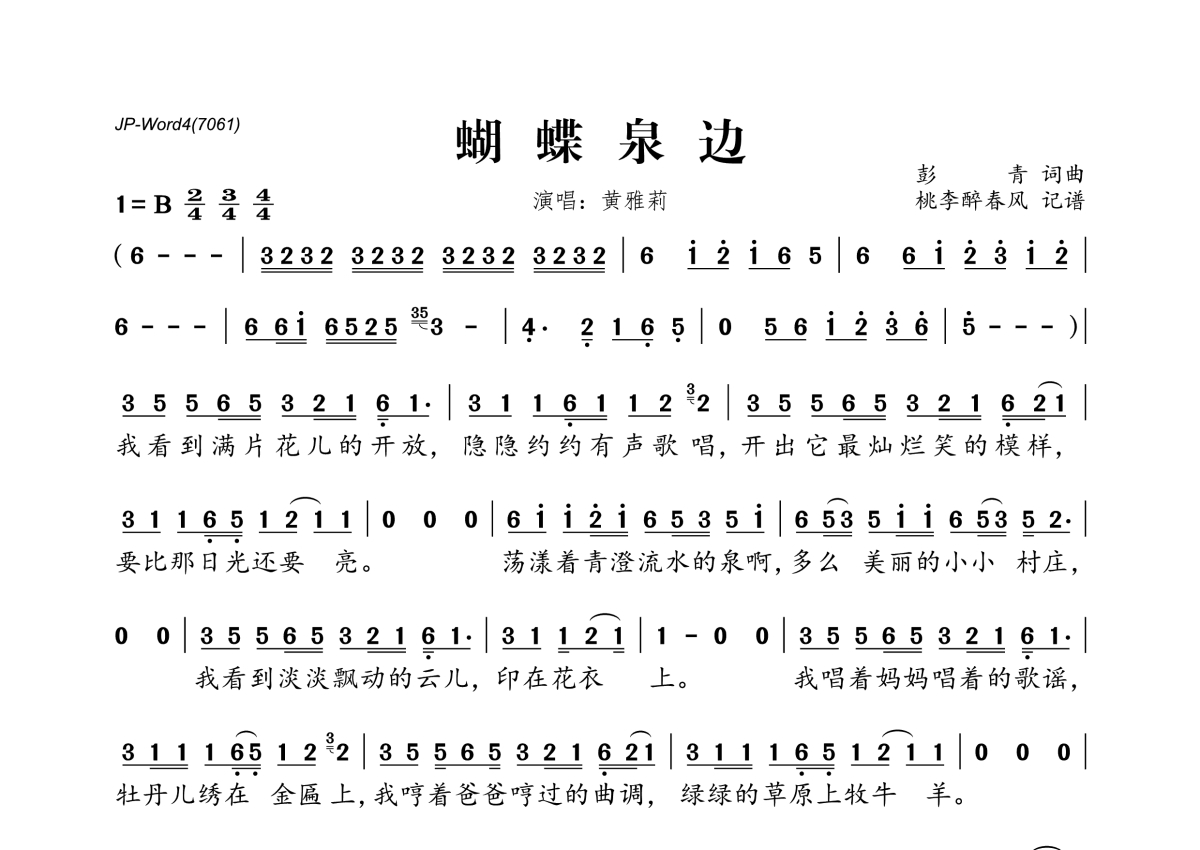 《蝴蝶泉边》是黄雅莉演唱的一首歌曲,这份简谱共有两张高清图谱,图谱由 @桃李醉春风 编配上传。