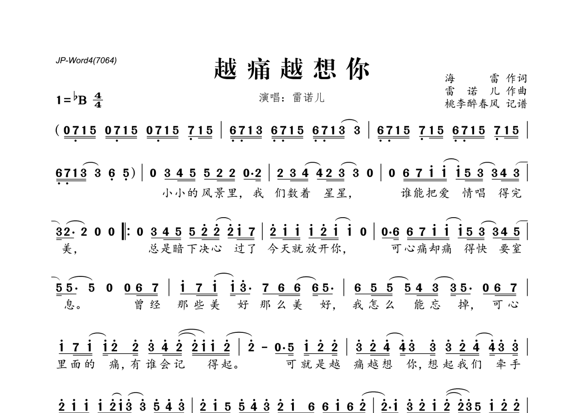 《越痛越想你》是雷诺儿演唱的一首歌曲,拍号为4/4拍,这份简谱共有一张高清图谱,图谱由 @桃李醉春风 编配上传。