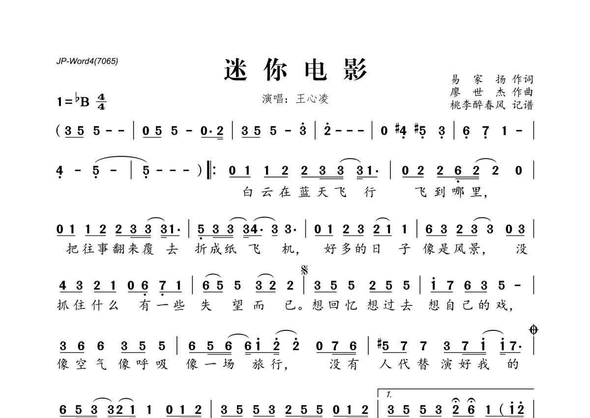 《迷你电影》是王心凌演唱的一首歌曲,拍号为4/4拍,这份简谱共有一张高清图谱,图谱由 @桃李醉春风 编配上传。
