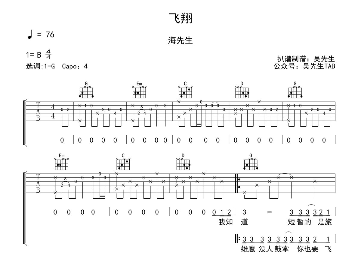 海先生《飞翔》吉他谱 - G调弹唱六线谱