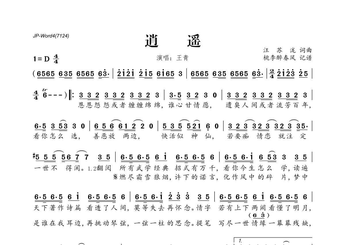 《逍遥》是王青演唱的一首歌曲,拍号为4/4拍,这份简谱共有一张高清图谱,图谱由 @桃李醉春风 编配上传。