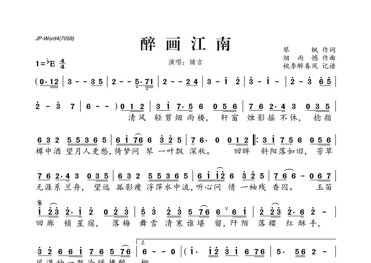 《醉画江南》是臻言演唱的一首歌曲,拍号为4/4拍,这份简谱共有一张高清图谱,图谱由 @桃李醉春风 编配上传。