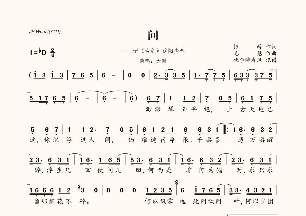 《问》是天时演唱的一首歌曲,拍号为2/4拍,这份简谱共有一张高清图谱,图谱由 @桃李醉春风 编配上传。