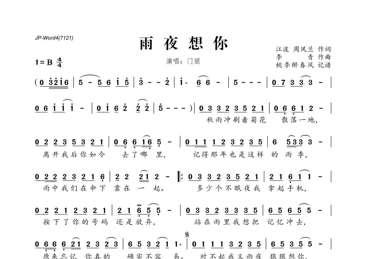《雨夜想你》是门丽演唱的一首歌曲,拍号为4/4拍,这份简谱共有一张高清图谱,图谱由 @桃李醉春风 编配上传。