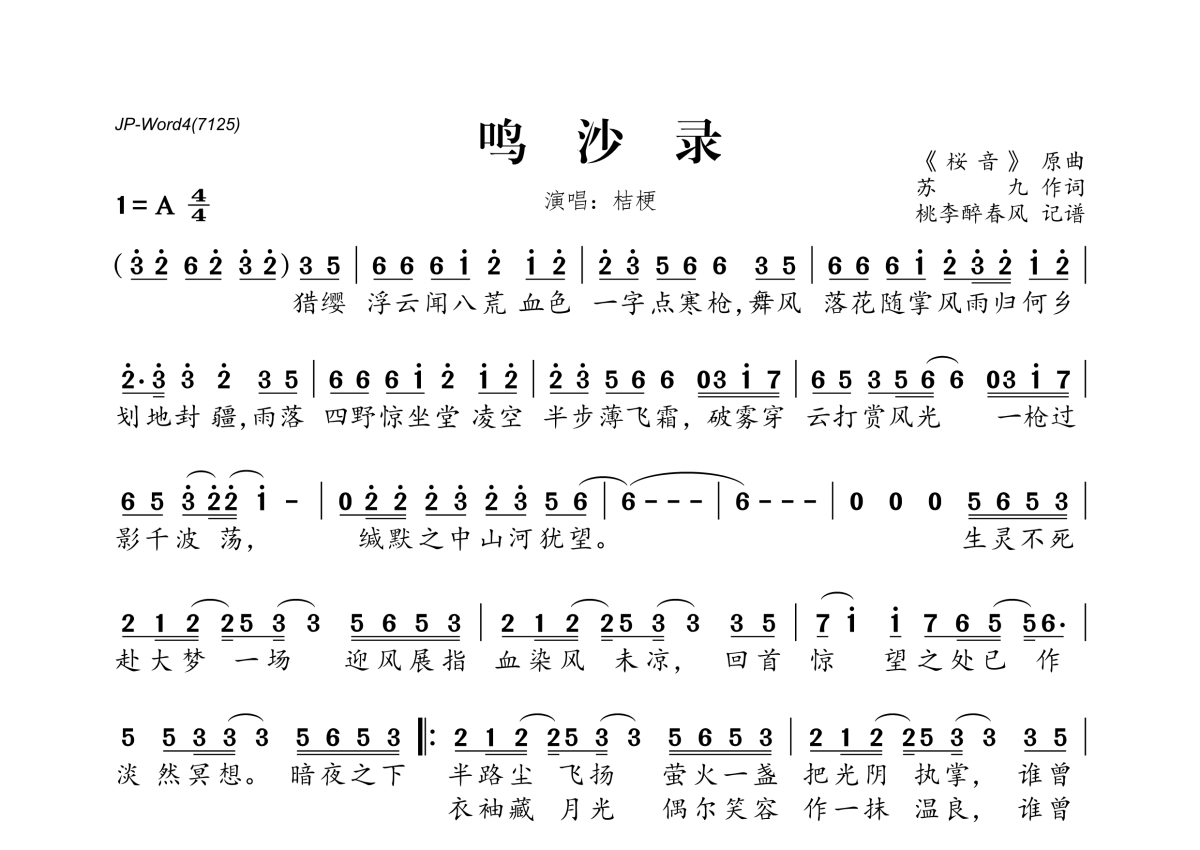 《鸣沙录》是桔梗演唱的一首歌曲,拍号为4/4拍,这份简谱共有两张高清图谱,图谱由 @桃李醉春风 编配上传。