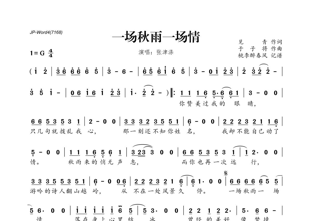《一场秋雨一场情》是张津涤演唱的一首歌曲,拍号为4/4拍,这份简谱共有一张高清图谱,图谱由 @桃李醉春风 编配上传。