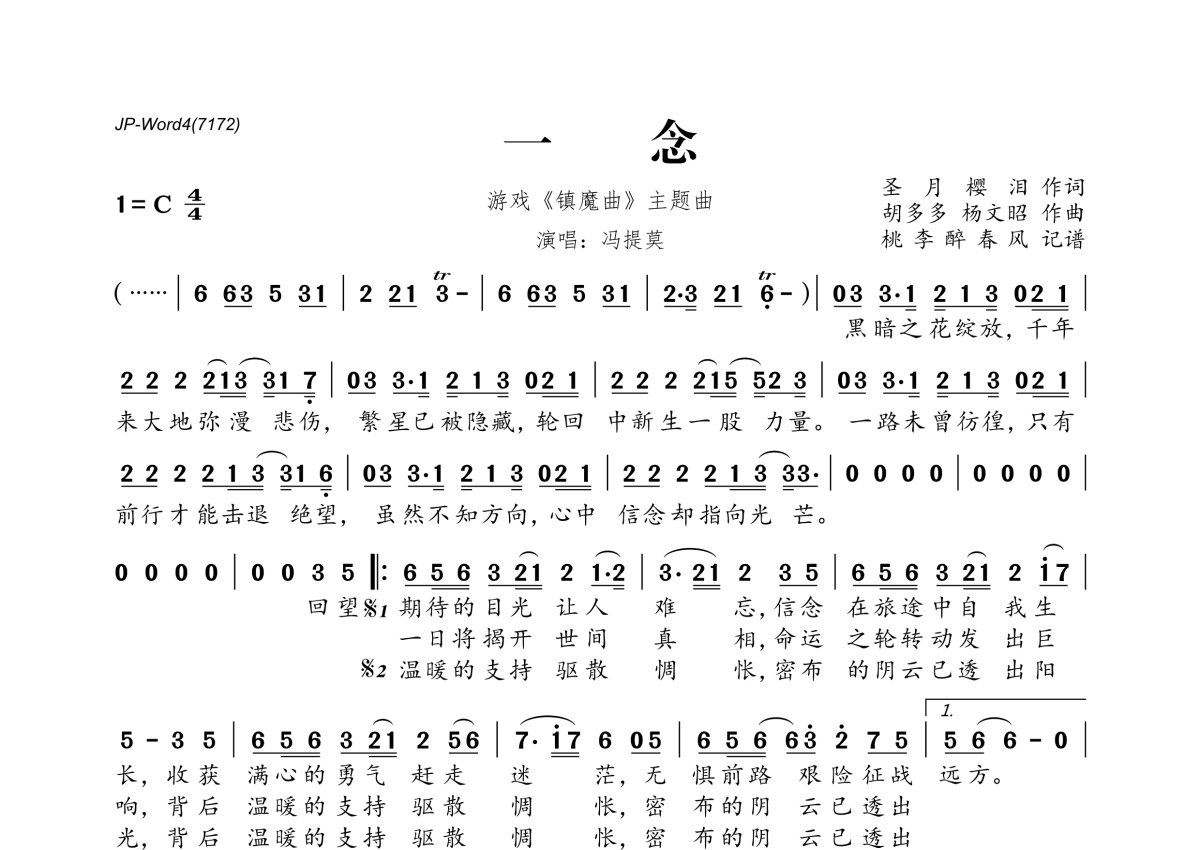 《一念》是冯提莫演唱的一首歌曲,拍号为4/4拍,这份简谱共有一张高清图谱,图谱由 @桃李醉春风 编配上传。