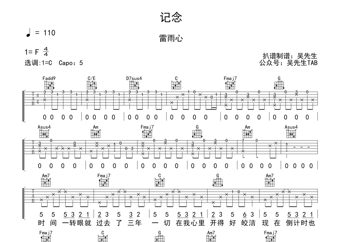 《纪念》是雷雨心演唱的一首歌曲,本吉他谱采用的是C调指法编配,这份吉他谱共有两张高清图谱,图谱由 @吴先生TAB 编配上传,图谱使用六线谱编配,包含吉他和弦指法、简谱以及歌词部分,使用这份纪念吉他谱,可以让你更加方便地掌握这首歌曲的弹唱技巧,快来尝试吧。雷雨心《纪念》吉他谱_C调吉他弹唱谱。