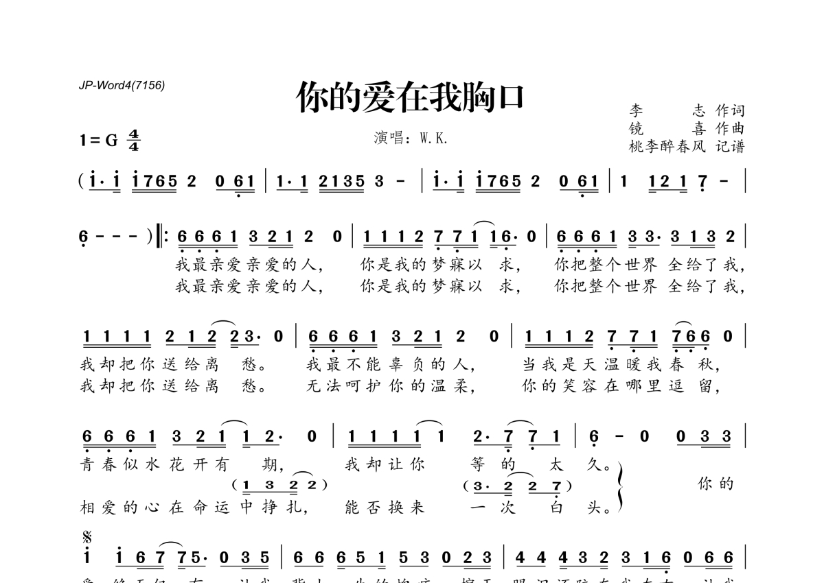 《你的爱在我胸口》是W.K.演唱的一首歌曲,拍号为4/4拍,这份简谱共有一张高清图谱,图谱由 @桃李醉春风 编配上传。