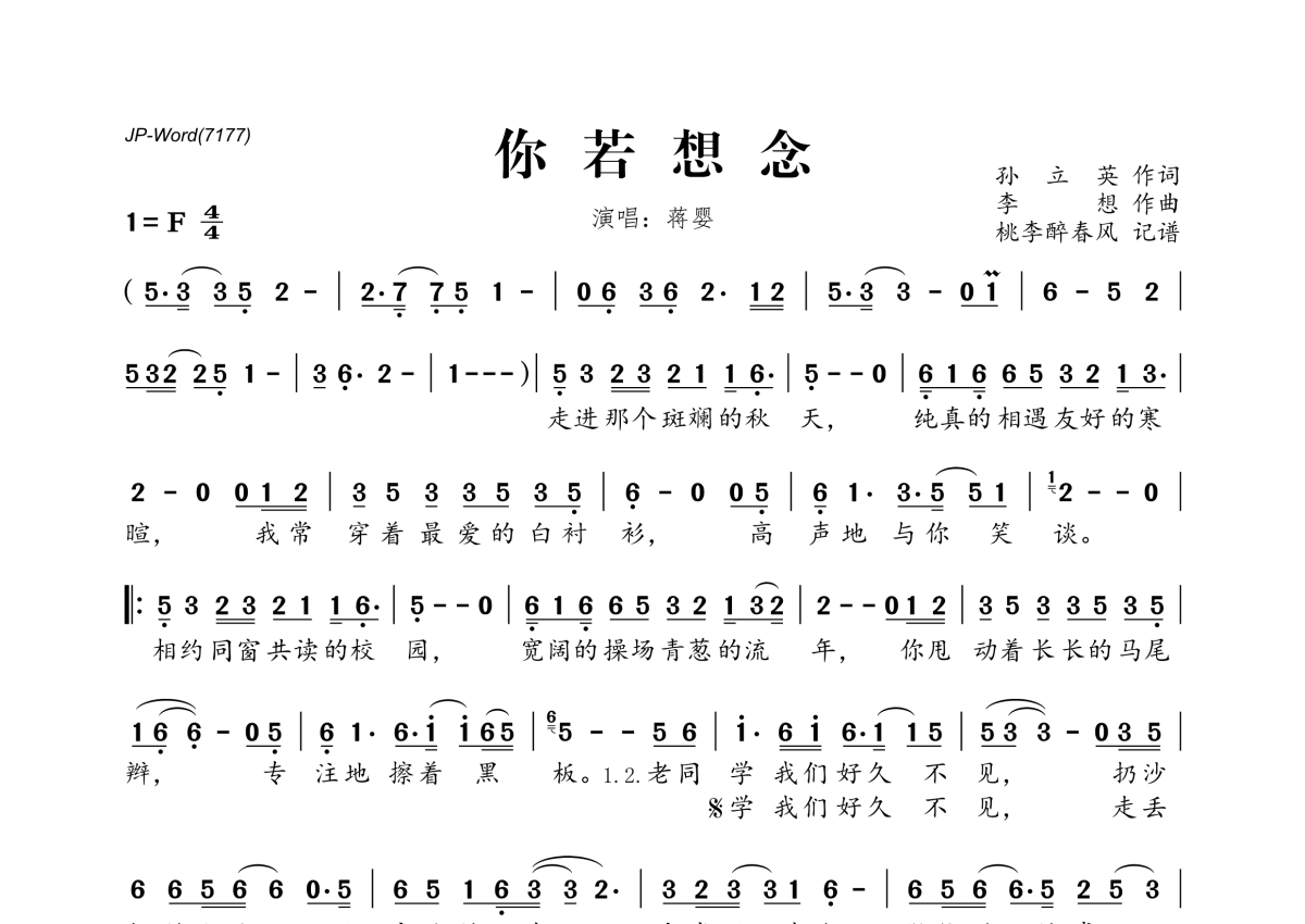《你若想念》是蒋婴演唱的一首歌曲,拍号为4/4拍,这份简谱共有一张高清图谱,图谱由 @桃李醉春风 编配上传。
