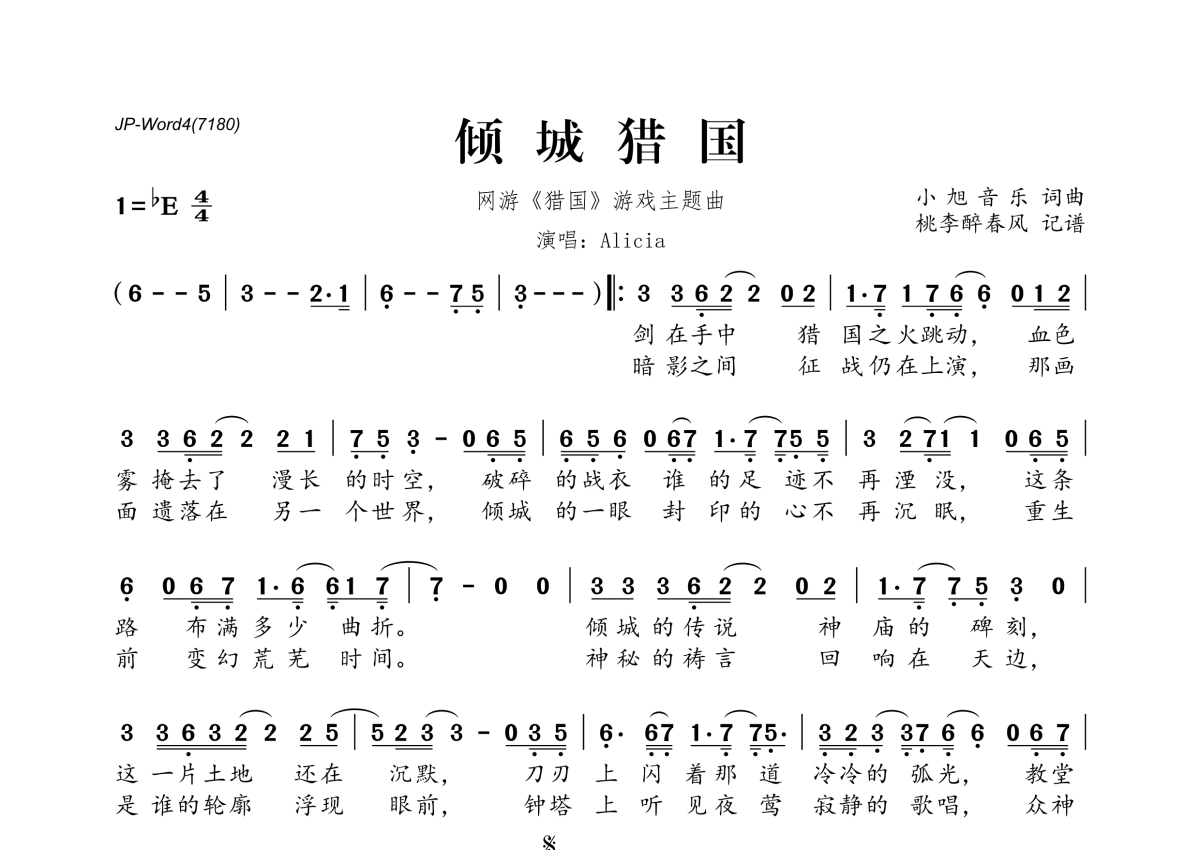 《倾城猎国》是Alicia演唱的一首歌曲,拍号为4/4拍,这份简谱共有一张高清图谱,图谱由 @桃李醉春风 编配上传。