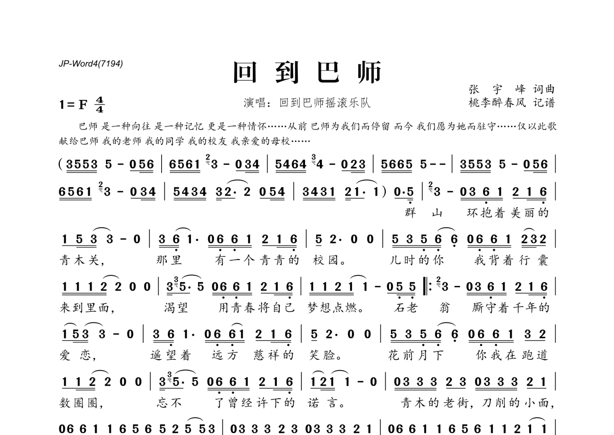 《回到巴师》是回到巴摇滚乐队演唱的一首歌曲,拍号为4/4拍,这份简谱共有一张高清图谱,图谱由 @桃李醉春风 编配上传。