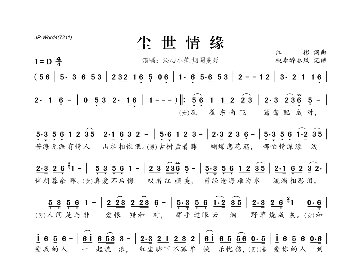《尘世情缘》是沁心小筑&烟圈蔓延演唱的一首歌曲,拍号为4/4拍,这份简谱共有一张高清图谱,图谱由 @桃李醉春风 编配上传。