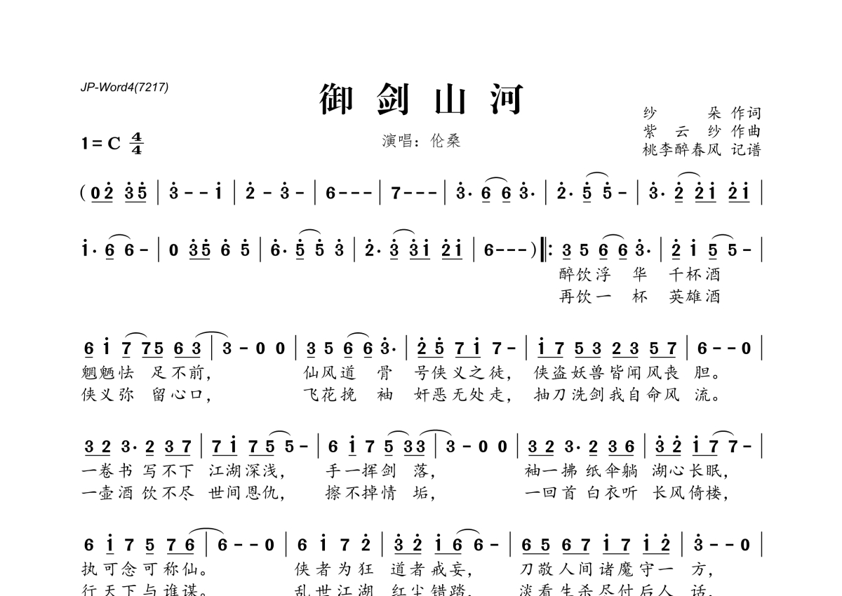 《御剑山河》是伦桑演唱的一首歌曲,拍号为4/4拍,这份简谱共有一张高清图谱,图谱由 @桃李醉春风 编配上传。