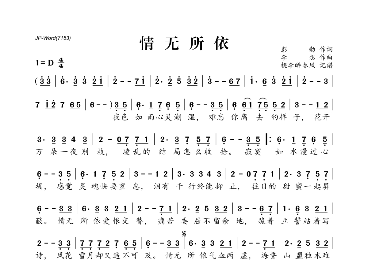 《情无所依》是陈瑞演唱的一首歌曲,拍号为4/4拍,这份简谱共有一张高清图谱,图谱由 @桃李醉春风 编配上传。